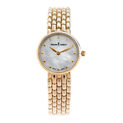 1. Philippe de Cheron Elisa round quartz 5001.1213N Корпус – жёлтое золото 14 карат, диаметр – 23 мм, толщина – 5,5 мм. Браслет – жёлтое золото 14 карат. Общий вес золота – 40,2 г. Сапфировое стекло. Водонепроницаемость 3 атм. (30 м). Механизм – кварцевый «Ronda 751». Циферблат – белый, перламутровый, золотые стрелки и часовые метки. |