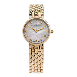 3. Philippe de Cheron Elisa oval quartz 5002.1213N Корпус – жёлтое золото 14 карат, размеры – 21,5x24мм, толщина – 5,5мм. Браслет – жёлтое золото 14 карат. Общий вес золота – 40,2 г. Сапфировое стекло. Водонепроницаемость 3 атм. (30 м). Механизм – кварцевый «Ronda 751». Циферблат – белый, перламутровый, золотые стрелки и часовые метки. |