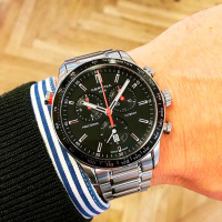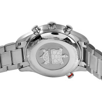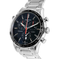 Функции: Индикация часов, минут при помощи центральных стрелок. Хронограф с 12-ти часовым, 60-ти секундным и 30-ти минутным счетчиками, индикация даты и вынесенная секундная стрелка на "6 часов". Тахиметрическая шкала.