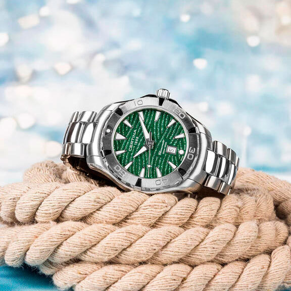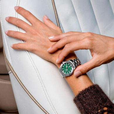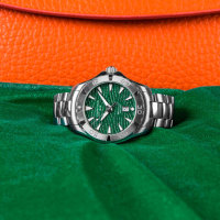 Корпус: Корпус из нержавеющей стали. Сапфировое стекло с антибликовым покрытием. Зеленый переливающийся циферблат, стальные стрелки и часовые индексы. Вращающийся безель. Диаметр 34,3 мм. Водонепроницаемость 300 метров.