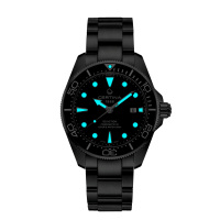 Корпус: Нержавеющая сталь 316L с повышенной устойчивостью к коррозии. Чёрный керамический безель имеет не только красивый внешний вид, но обладают устойчивостью к царапинам, гипоаллергенностью и способностью долгое время сохранять первоначальную яркость и блеск. Циферблат чёрного цвета, серебристые полированные стрелки и часовые индексы с покрытием Superluminova, которое обеспечивает длительную подсветку в темное время суток. Крупная индикация времени позволяет считывать показания с циферблата в любой ситуации. Сапфировое стекло с односторонним антибликовым покрытием устойчивое к появлению царапин, обладающее высокой прозрачностью. Диаметр 43 мм. Водозащита 300 м.