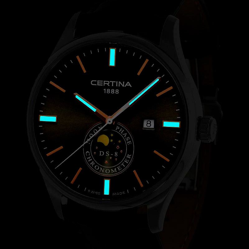 Корпус: Корпус из нержавеющей стали. Коричневый циферблат, золотистые стрелки и часовые индексы с люминесцентным покрытием. Сапфировое стекло с антибликовым покрытием. Диаметр 41 мм. Водостойкость 100 м.