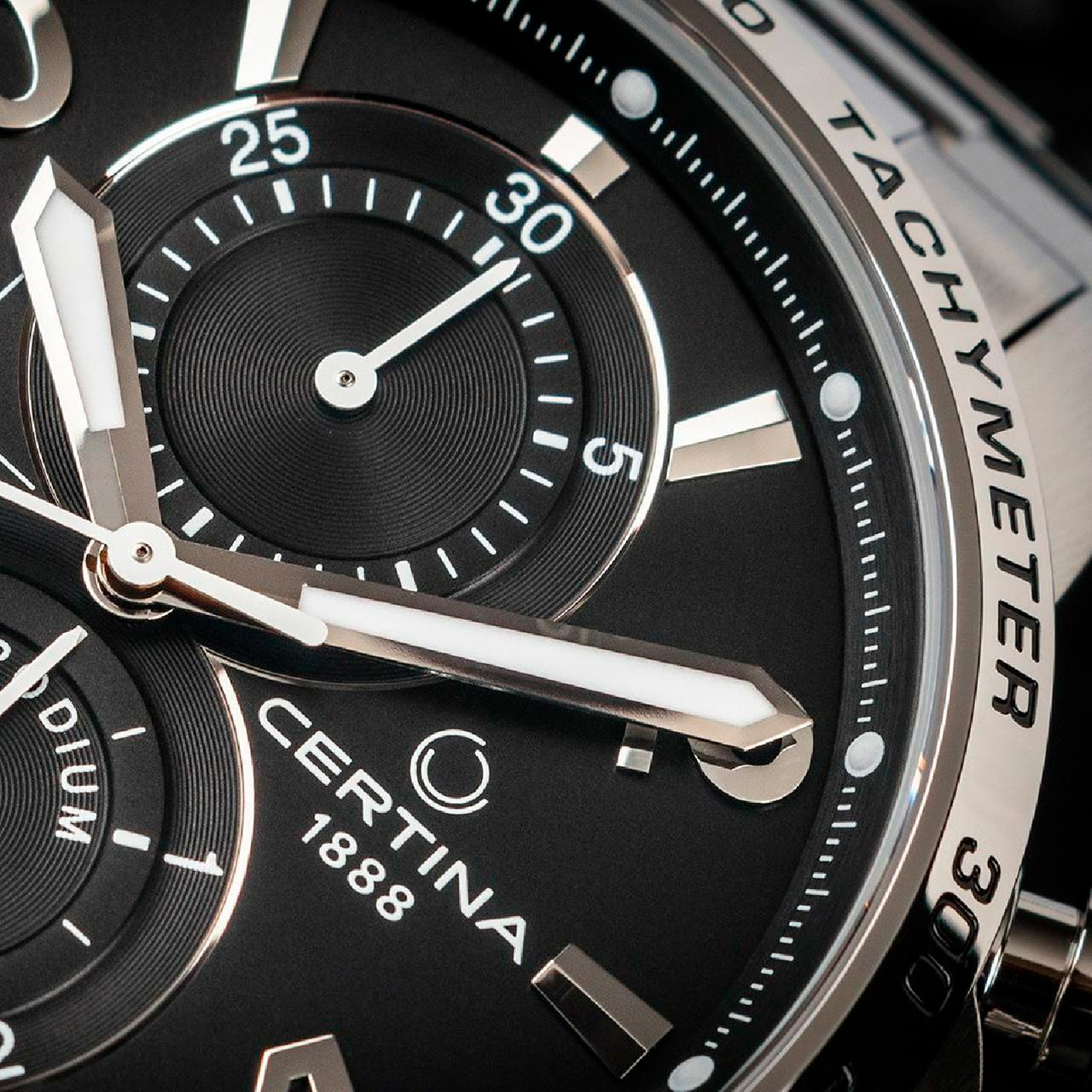 Функции: Центральные часовая и минутная стрелки, маленькая секундная стрелка. Апертура даты на «4 часа». Хронограф: центральная секундная стрелка, 30-минутный и 1/10-секундный индикаторы. Тахиметр.