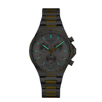 Функции: Индикация часов, минут при помощи центральных стрелок. Окошко даты на 4 часа. Хронограф. Счетчик 1/10 сек расположен в положении 2 часа, 30-минутный счетчик на 10 часов, малая секунда на 6 часов. Тахиметрическая шкала на безеле. Индикатор окончания срока службы элемента питания