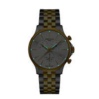 Функции: Центральные часовая и минутная стрелки, секундная стрелка вынесена на отдельный циферблат. Окошко даты находится в положении 4 часов. Хронограф.