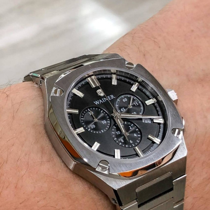 Корпус: Корпус часов выполнен из нержавеющей стали с матовой и полированной отделкой. Безель с декоративными винтами. Циферблат чёрного цвета выполнен по технологии Sunray (солнечные лучи) и защищен прочным сапфировым стеклом. Метки в виде штрихов. Клиновидные стрелки в стиле Dauphine с люминесцентным покрытием, которое светится в темноте после непродолжительной зарядки на свету. Граненая заводная головка. Завинчивающаяся задняя крышка. Диаметр корпуса 43 мм. Водонепроницаемость 50 метров.