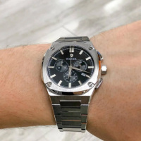Функции: Центральные часовая и минутная стрелки, маленький секундный индикатор на «3 часах». Апертура даты находится в положении 3 часа. Хронограф с центральной секундной стрелкой.