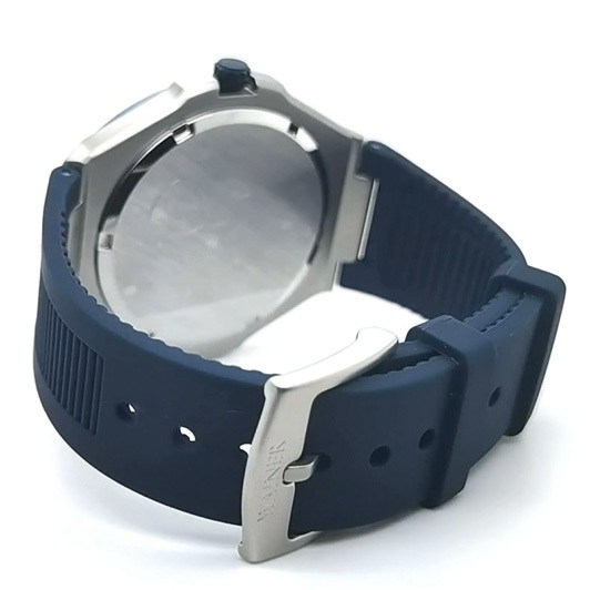 Корпус: Круглый корпус выполнен из нержавеющей стали. Циферблат синего цвета с метками в виде штрихов, надежно защищен минеральным стеклом. Заводная головка с защитой. Диаметр корпуса 44 мм. Водонепроницаемость 50 метров.
