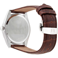 Ремешок: Коричневый ремешок из телячьей кожи с тиснением под аллигатора. Браслетная застежка из нержавеющей стали, раскладывающаяся при нажатии кнопок двойной блокировки.