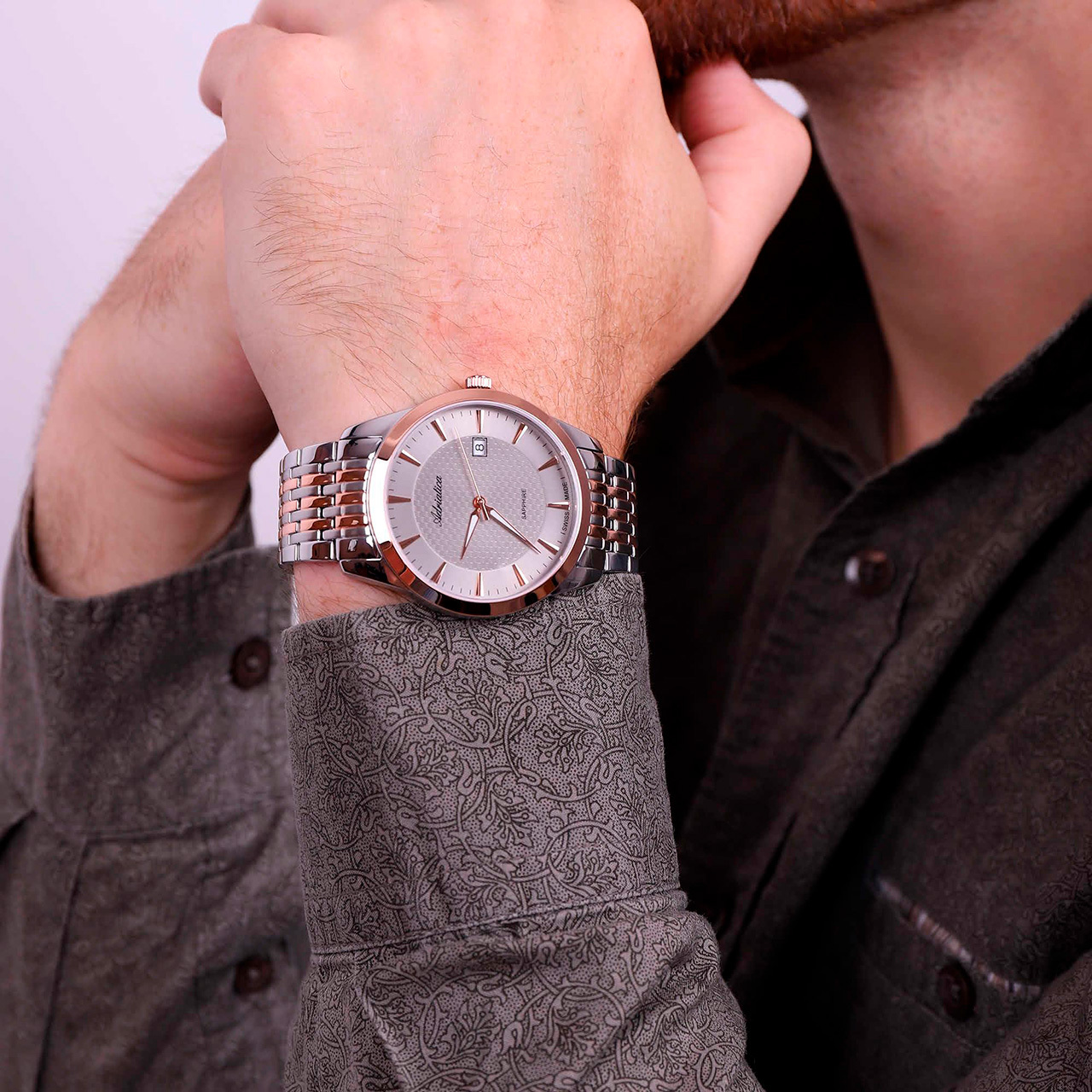 Корпус: Круглый корпус выполнен из полированной нержавеющей стали с частичным PVD покрытием. Светлый циферблат. Накладные часовые индексы выполнены из стали с золотым покрытием. Стрелки с покрытием SuperLuminova, которое обеспечивает подсветку в темное время суток. Сапфировое стекло. Диаметр корпуса составляет 40 мм, толщина 7 мм. Водостойкость WR 50 (мытье рук, дождь).