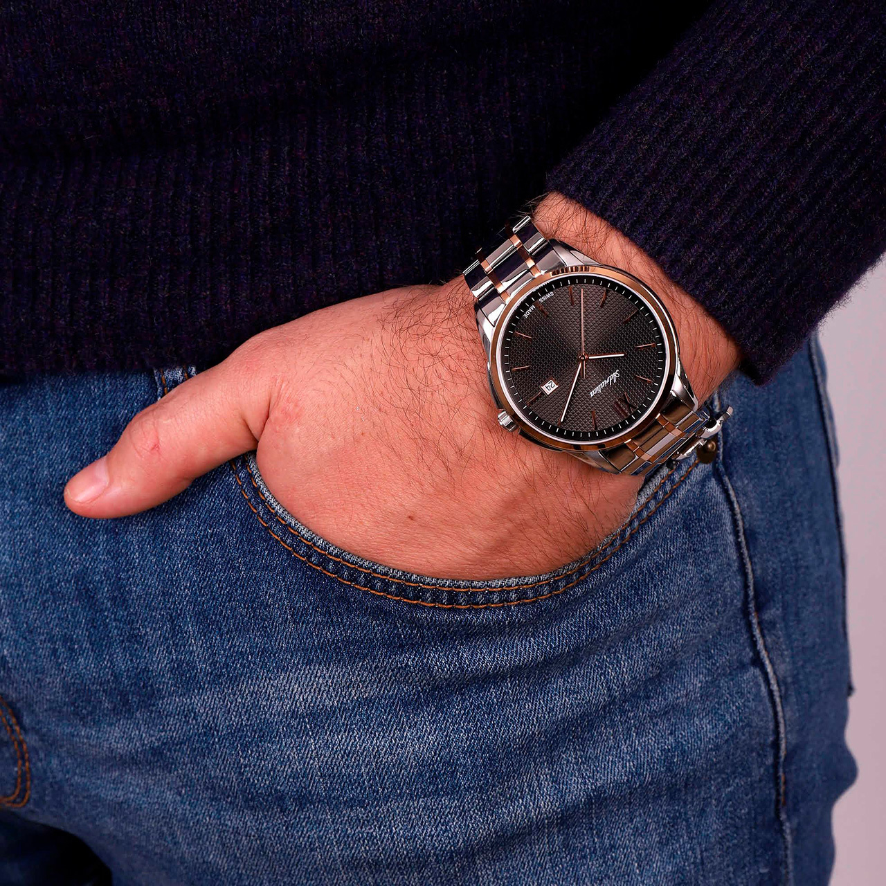 Ремешок: Браслет выполнен из нержавеющей стали с частичным PVD покрытием розового золота, поверхности с различными видами финишной обработки. Браслетная раскладывающаяся застежка с дополнительным защитным фиксатором, гравировка с названием марки и ее эмблема.