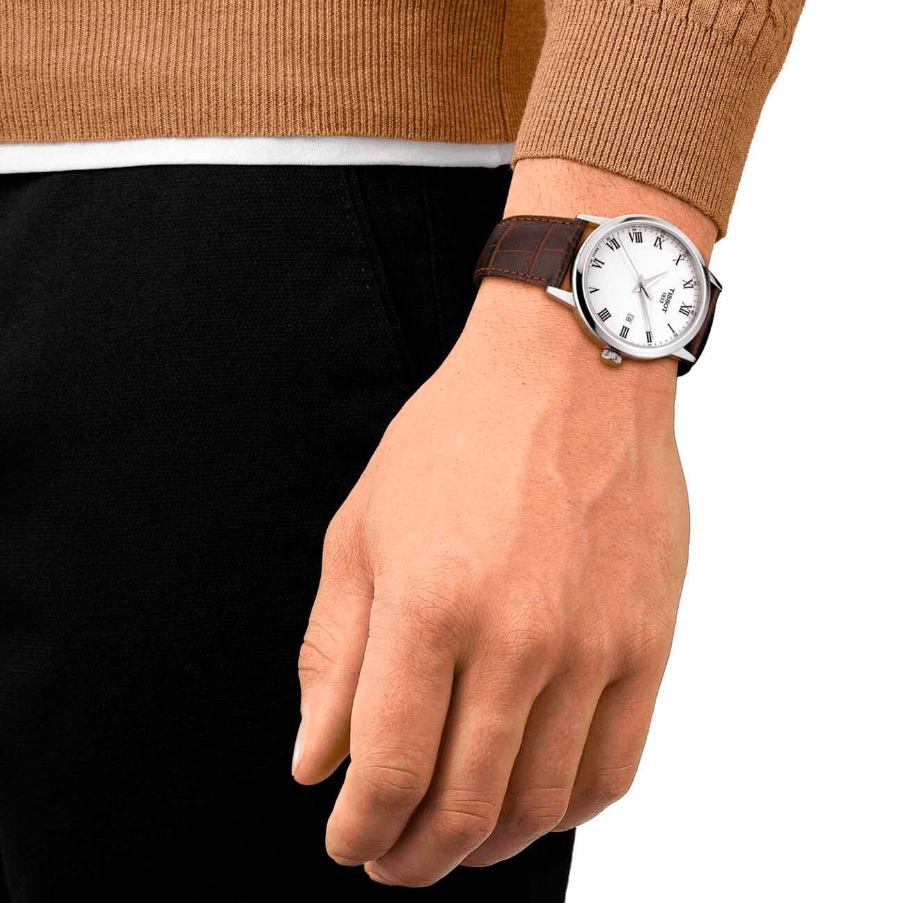 Ремешок: Коричневый ремешок из телячьей кожи с тиснением под аллигатора с классической застежкой.