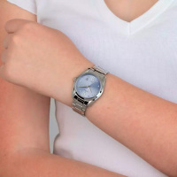 Корпус: Корпус круглой формы выполнен из нержавеющей стали марки 316L. Циферблат выполнен по технологии Sunray (солнечные лучи) голубого цвета. Серебристые стрелки и метки, украшены кристаллами. Минеральное стекло. Диаметр корпуса модели составляет 36,8 мм. Водостойкость 50 метров (5 АТМ).