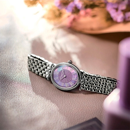 Корпус: Корпус овальной формы из 3 частей выполнен из нержавеющей стали марки 316L, поверхности с финишной полировкой. Циферблат из перламутра с гильошированием в стиле “капли воды”. Печать римских цифр в винтажном стиле и фигурные стрелки с покрытием цвета родия отполированные вручную. Сапфировое стекло выпуклой формы имеет повышенную устойчивость к возникновению царапин. Боковая поверхность имеет насечку в стиле “ребро монеты”. Переводная коронка украшена кабошоном. Задняя крышка соединяется с корпусом при помощи 4 винтов. Ширина корпуса модели составляет 25 мм, высота - 30 мм, толщина – 6,8 мм. Водостойкость 30 метров (3 АТМ).
