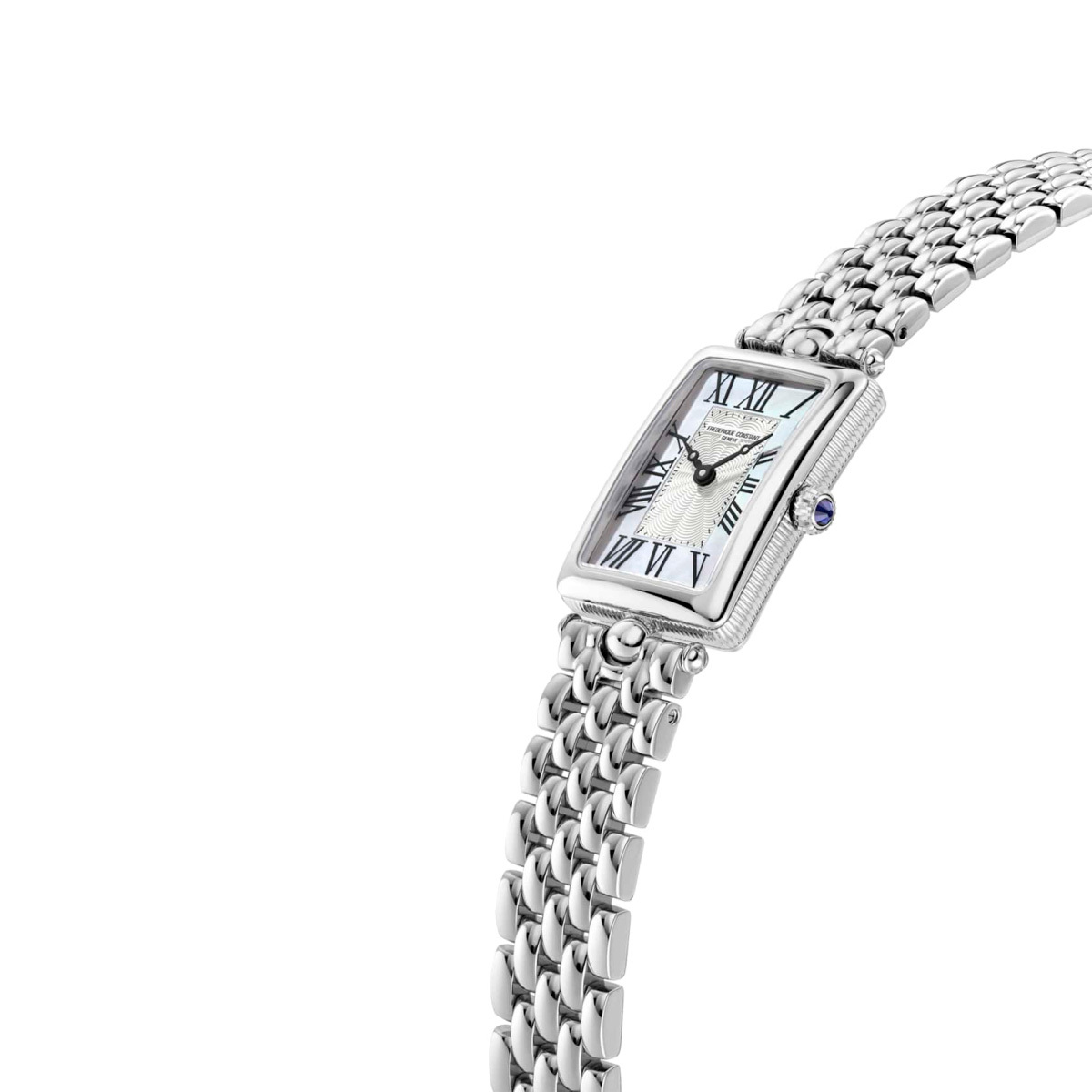 Корпус: Корпус прямоугольной формы из 3 частей выполнен из нержавеющей стали марки 316L, поверхности с финишной полировкой. Циферблат из перламутра, центральная часть с гильошированием в стиле “капли воды”. Печать римских цифр в винтажном стиле и фигурные стрелки черного цвета отполированные вручную. Сапфировое стекло выпуклой формы имеет повышенную устойчивость к возникновению царапин. Переводная коронка украшена кабошоном. Ширина корпуса модели составляет - 20,7 мм, высота - 28 мм, толщина – 6,98 мм. Водостойкость 30 метров (3 АТМ).