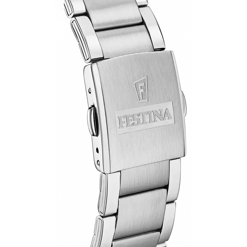 Ремешок: Стальной браслет с раскладывающейся застежкой, которая украшена фирменным логотипом Festina.