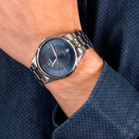 Корпус: Ударопрочный корпус часов сделан из нержавеющей стали. Синий циферблат с серебристыми стрелками и часовыми индексами в виде штрихов и римских цифр. Стрелки с люминесцентным покрытием, которое светится в темноте после непродолжительной зарядки на свету. Минеральное стекло устойчивое к возникновению царапин. Диаметр: 43 мм. Водонепроницаемость: 50 м.