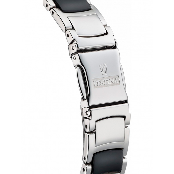 Ремешок: Стальной браслет с чёрными керамическими вставками. Застежка украшена фирменным логотипом Festina, на кнопочной фиксации.