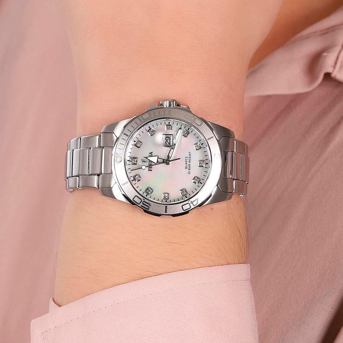 Корпус: Ударопрочный корпус часов сделан из нержавеющей стали. Перламутровый циферблат, метки в виде точек украшены кристаллами. Стрелки с нанесенным люминесцентным покрытием, которое светится в темноте после непродолжительной зарядки на свету. Минеральное стекло. Вращающийся безель. Рифленая заводная головка с защитой. Диаметр: 34,5 мм. Водонепроницаемость: 100 м.