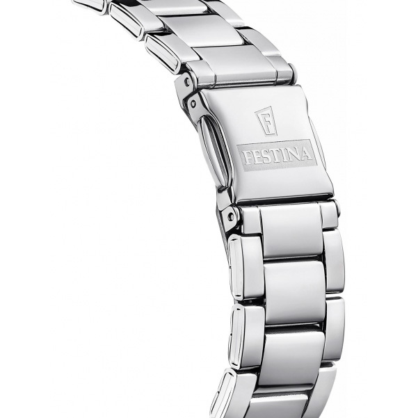 Ремешок: Стальной браслет с раскладывающейся застежкой, которая украшена фирменным логотипом Festina.
