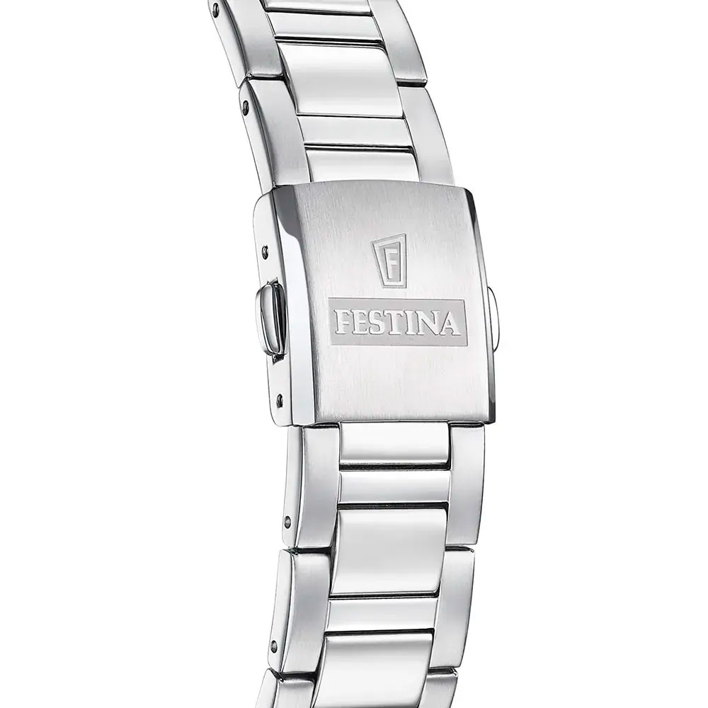Ремешок: Надежный стальной браслет с раскладывающейся застежкой, которая украшена фирменным логотипом Festina.