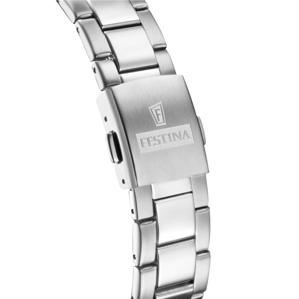 Ремешок: Надежный стальной браслет с раскладывающейся застежкой, которая украшена фирменным логотипом Festina.