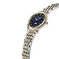 Корпус: Корпус выполнен из нержавеющей стали с частичным покрытием жёлтого золота. Перламутровый циферблат синего цвета с часовыми индексами в виде штрихов и точек, украшен 8 бриллиантами 0,04К. Устойчивое к возникновению мелких механических повреждений сапфировое стекло. Заводная головка украшена камнем в форме кабошона. Диаметр корпуса 30 мм, толщина 8 мм. Водостойкость: 30 м (WR 30).