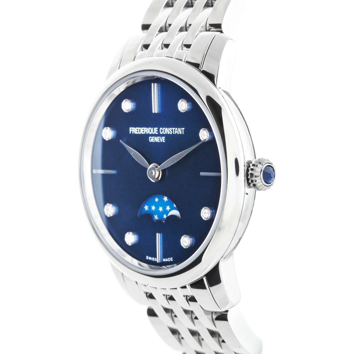 Корпус: Нержавеющая сталь. Циферблат синего цвета, серебристые риски и стрелки, 8 бриллиантов. Сапфировое стекло. Водонепроницаемость 30 метров. Диаметр 30 мм.
