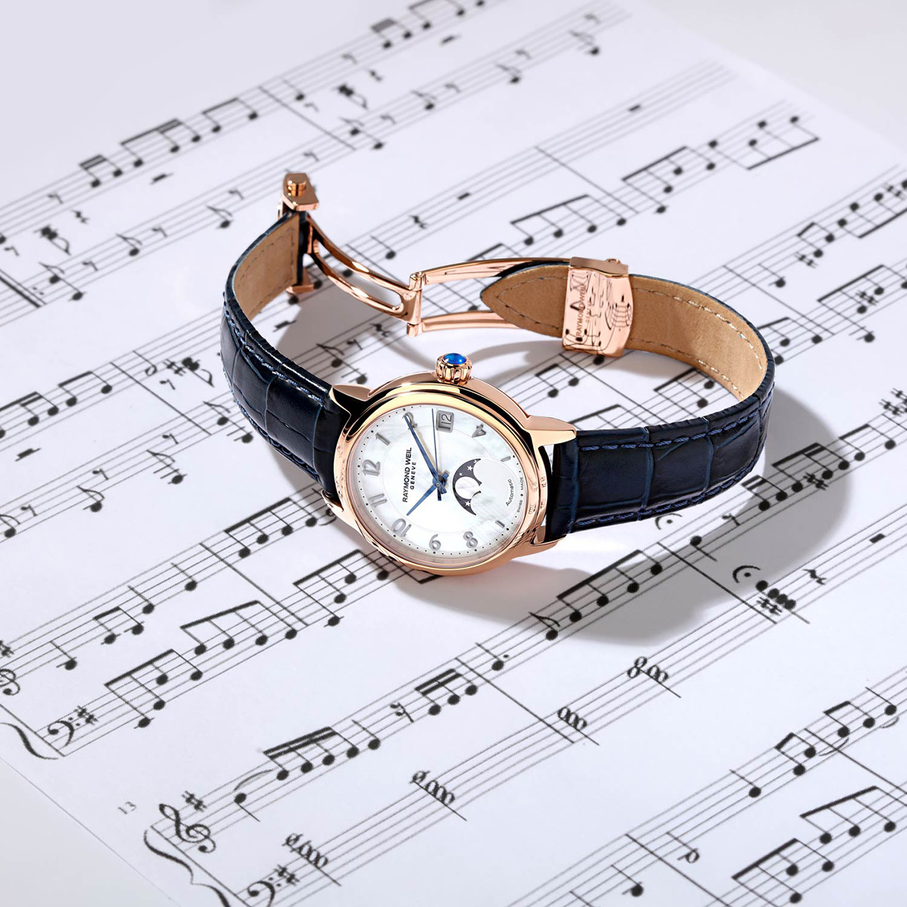 Функции: Центральные часовая, минутная и секундная стрелки, индикация даты. Фигурная апертура в нижней части циферблата открывает указатель фазы Луны.