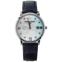 Корпус: Нержавеющая сталь. Циферблат белый перламутровый украшен бриллиантами. Сапфировое стекло. Диаметр 36 мм. Водонепроницаемость 30 метров.