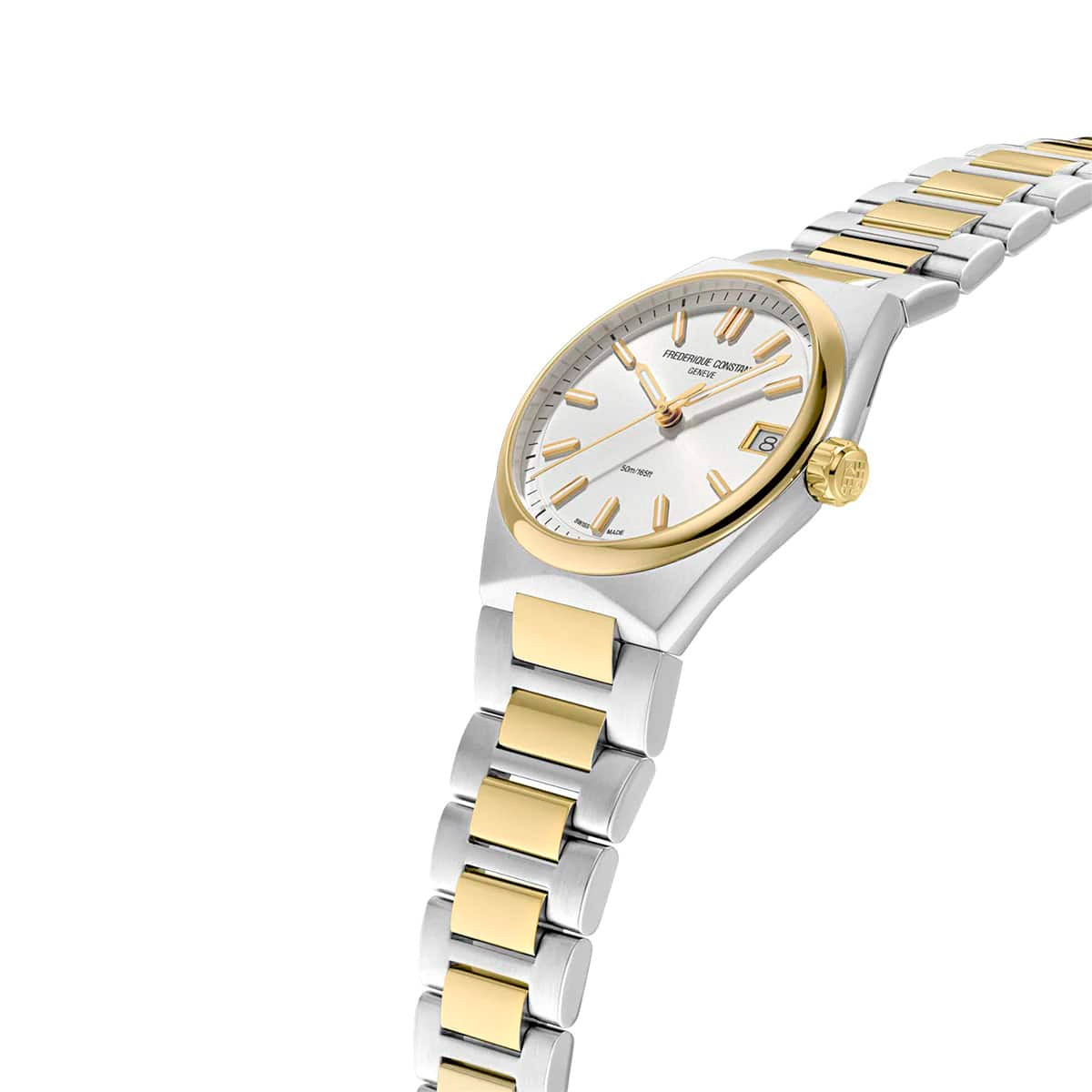 Ремешок: Браслет с литыми звеньями из нержавеющей стали, стойкое к царапинам покрытие цвета золота на центральных звеньях, пружинная система быстрой замены ремешка/браслета, браслетная застежка тройного сложения “бабочка” раскладывается при нажатии на кнопки двойной фиксации. Сменный ремешок белого цвета из натурального каучука с тиснением, классическая застежка пряжка.