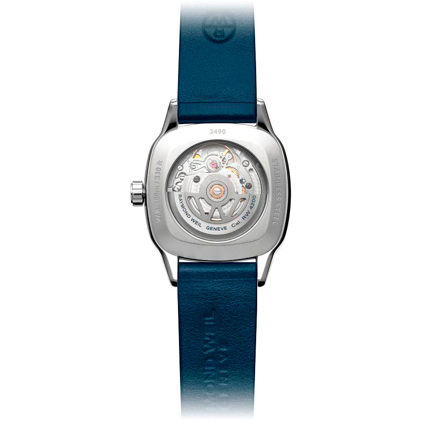 Ремешок: Кожаный ремешок синего цвета с раскладывающейся застежкой. Застежка с двойной системой защиты, украшена гравировкой Raymond Weil.