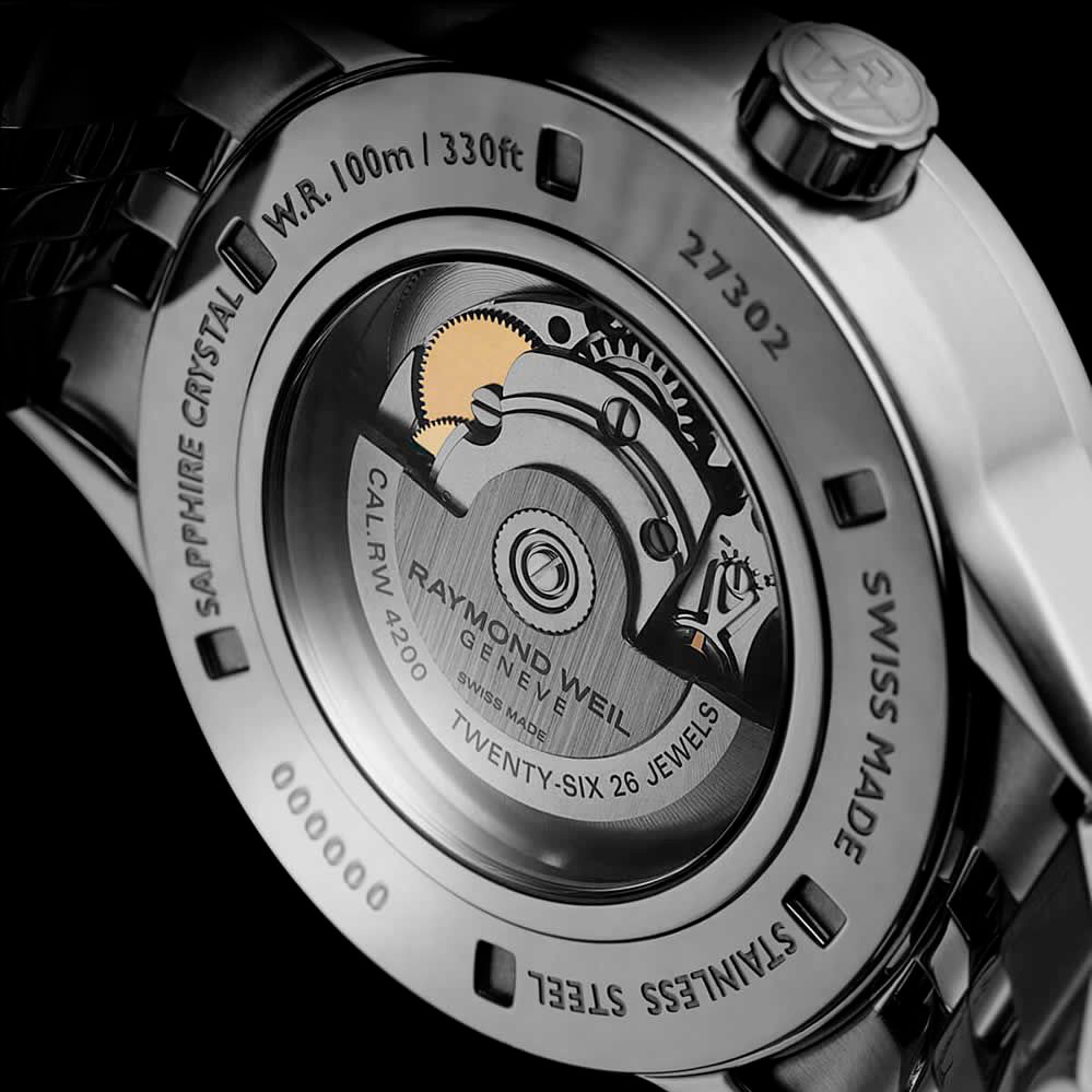 Ремешок: Модель на браслете из высококачественной стали с 5 рядами литых звеньев. Браслетная застежка, раскладывающаяся при нажатии на кнопки с двойной системой блокировки, украшена гравировкой Raymond Weil.