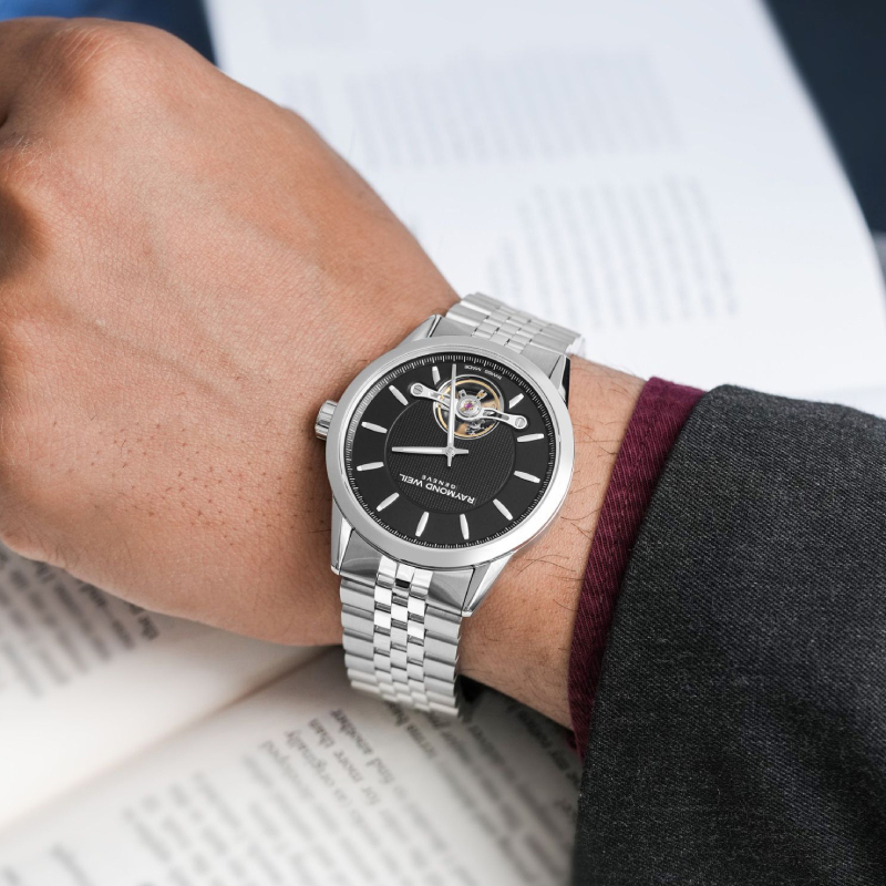 Ремешок: Браслет из высококачественной стали с 5 рядами литых звеньев. Браслетная застежка, раскладывающаяся при нажатии на кнопки с двойной системой блокировки, украшена гравировкой Raymond Weil.