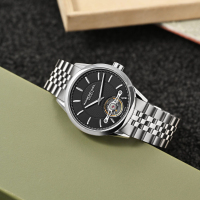 Механизм: Швейцарский механизм с автоподзаводом, калибр RW1212, с запасом хода 38 часов и частотой 28 800 пк/час. Видимая со стороны циферблата работа анкерного спуска и колебания балансового колеса. Частично скелетонизированные мосты и платина механизма.