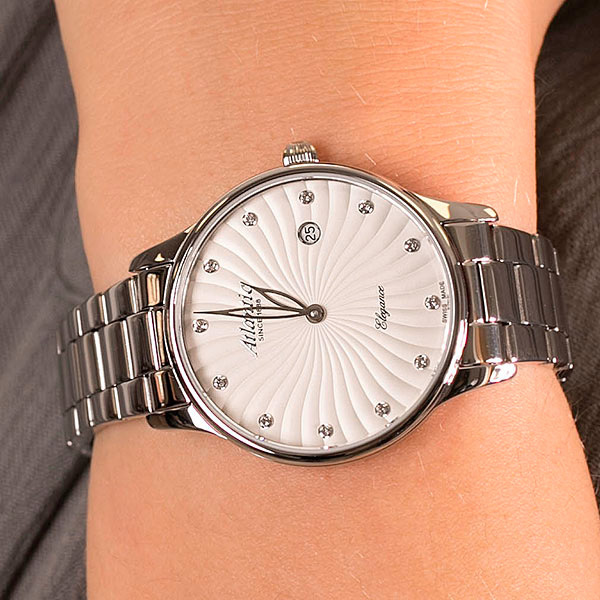 Корпус: Нержавеющая сталь марки 316L. Металлик циферблат с гильошированием. Серебристые полированные стрелки, а также кристаллы в местах часовых меток. Сапфировое стекло. Диаметр: 34 мм. Водонепроницаемость: 30 метров.