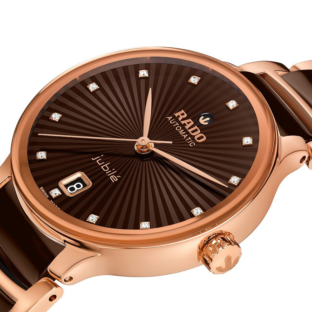 Корпус: Нержавеющая сталь с PVD покрытием из розового золота. Коричневый граненый циферблат имеет роскошный трехмерный эффект, созданный путем штамповки фигурного циферблата с последующим заполнением его лаком. Циферблат декорирован 12 бриллиантами. Сапфировое стекло с антибликовым покрытием. Прозрачная задняя крышка. Диаметр 35 мм. Водозащита 50 метров позволит защитить корпус от случайных брызг или капель дождя.