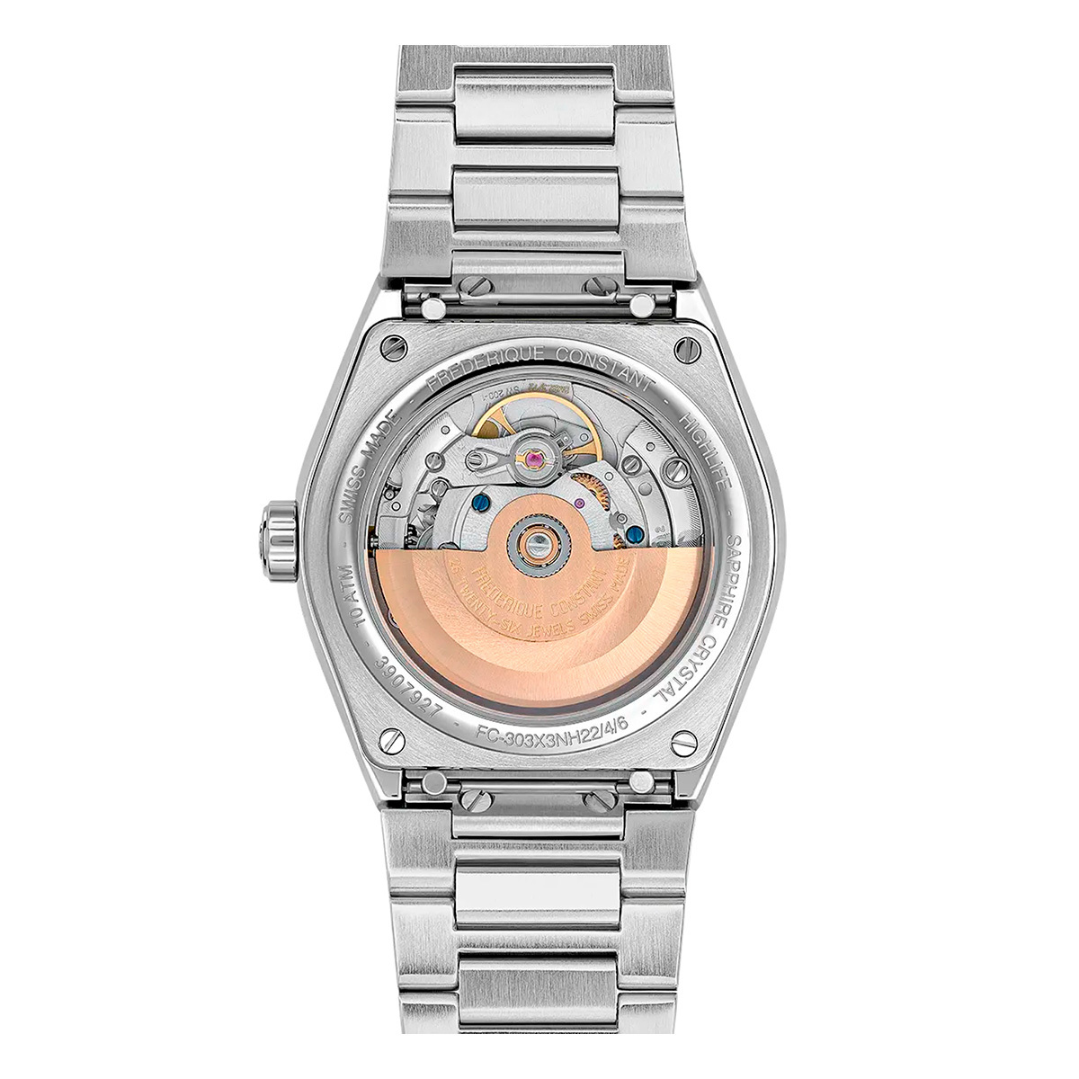 Механизм: Швейцарский механизм FC-303 с автоматическим подзаводом создан имеет запас хода 38 часов, частота колебаний баланса 28 800 пк/час (4Hz), 26 рубинов в качестве камневых опор колесной системы и палет анкерного спуска. Точность хода механизма часов линейки отрегулирована в соответствии с сертификатом C.O.S.C.