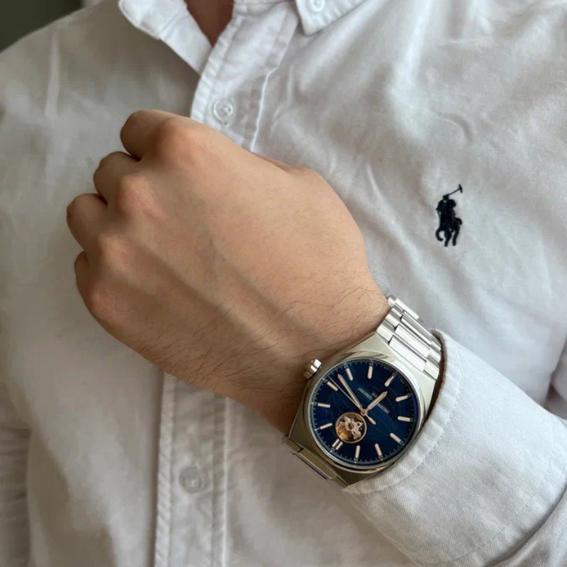 Корпус: Корпус модели выполнен из высококачественной стали с повышенной устойчивостью к коррозии, поверхности с матовой шлифовкой – сатинированием и полировкой до зеркального блеска. Циферблат синего цвета. Часовые индексы и стрелки покрыты родием с полировкой до алмазного блеска. Сапфировое стекло. Диаметр: 41 мм. Водозащита: 50 м.