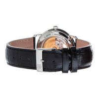 Корпус: Корпус выполнен из высококачественной нержавеющей стали с полировкой и матовой шлифовкой (сатинированием) поверхностей. Циферблат серебристого цвета с гильошированием в стиле "Clous de Paris", печатные римские цифры и фигурные стрелки черного цвета. Апертура в верхней части циферблата приоткрывает тайну работы часового механизма. Сапфировое стекло с повышенной устойчивостью к появлению царапин. Диаметр корпуса составляет 40 мм, толщина - 10 мм. Заводная коронка украшена логотипом марки. Задняя крышка с прозрачным окном имеет резьбовое соединение с корпусом. Водостойкость 6 АТМ.