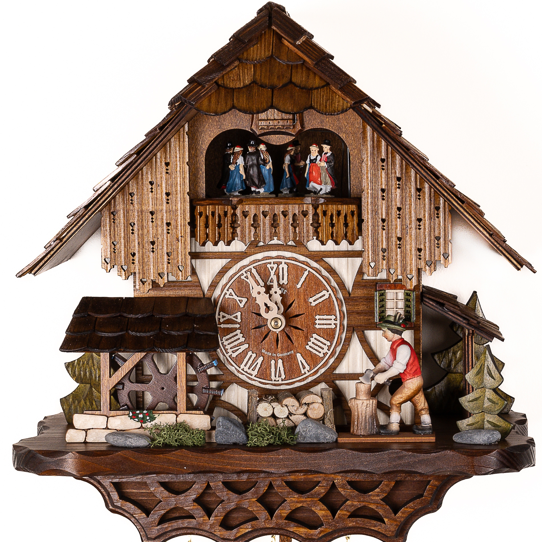 Механизм: Механические часы с кукушкой, которые работают от гирь на цепной тяге. Сделан механизм на фирме SBS-Feintechnik GmbH & Co. KG Германия. Запас хода на 8 дней. Ручное отключение звука. Шварцвальдский дом с подвижным дровосеком, мельничным колесом и танцующими парами на балконе. В каждые пол часа кукушка появляется из своего домика, наклоняется и воспроизводит звук кукушки (ку-ку) один раз, в каждый полный час она кукует столько раз сколько показывают стрелки на часах. После этого на балкончике начинают кружиться в танце деревянные фигурки под музыку (2 мелодии чередуются). Одна гиря в данных часах отвечает за ход часового механизма, вторая за механизм кукушки, а третья за воспроизведение музыки, как в музыкальной шкатулке, и за движение декоративных фигурок, водяной мельницы, танцующих пар на балконе. В то время пока кукушка кукует дровосек колет дрова и продолжает это делать пока кукушка не остановится.