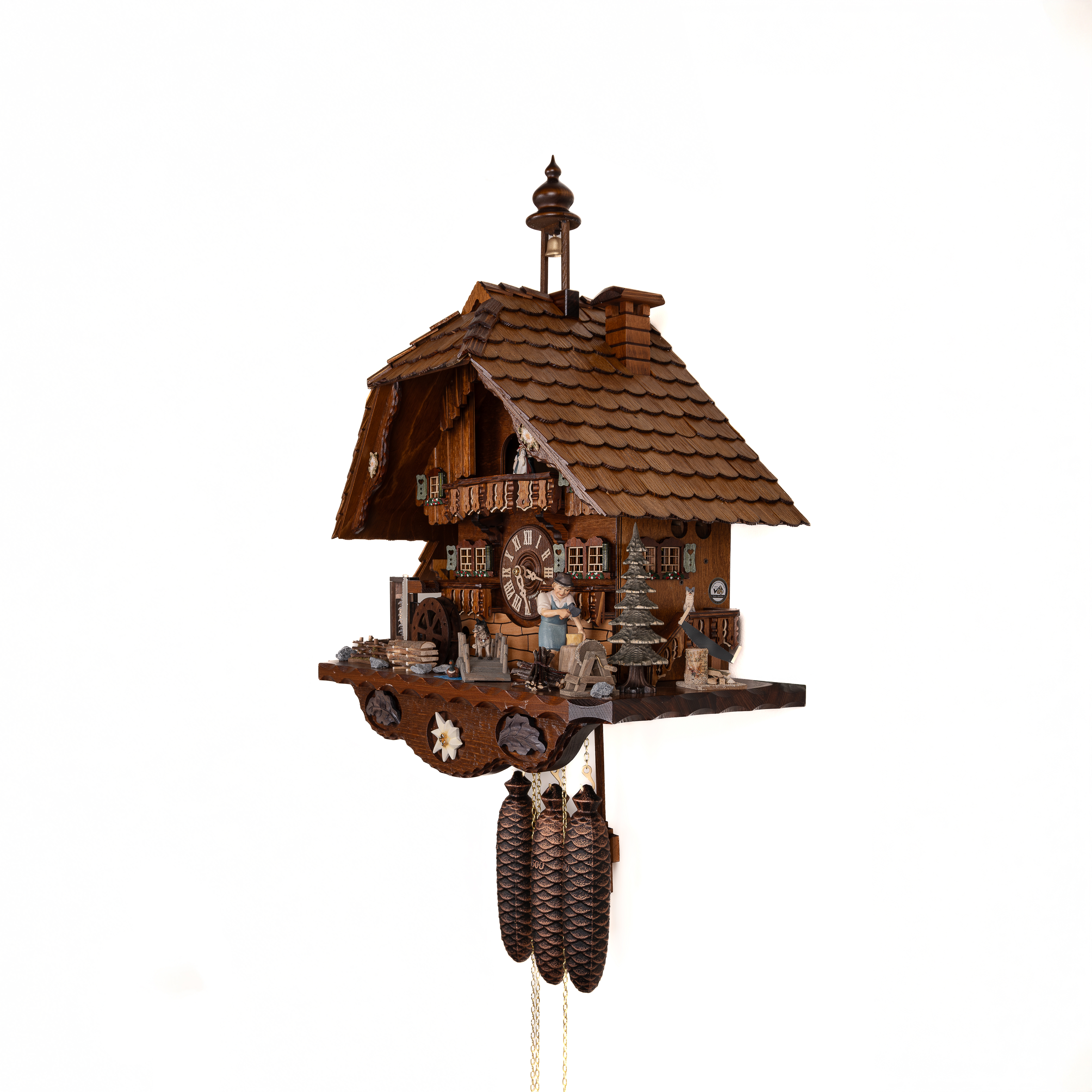 Механизм: Механические часы с кукушкой, которые работают от гирь на цепной тяге. Сделан на фирме SBS-Feintechnik GmbH & Co. KG Германия. Шварцвальдский дом с подвижным дровосеком и танцующими парами на балконе. Запас хода на 8 дней. Ручное отключение звука. В каждые пол часа кукушка появляется из своего домика, наклоняется и воспроизводит звук кукушки (ку-ку) один раз, в каждый полный час она кукует столько раз сколько показывают стрелки на часах. После этого на балкончике начинают кружиться в танце деревянные фигурки под музыку (2 мелодии чередуются). Одна гиря в данных часах отвечает за ход часового механизма, вторая за механизм кукушки, а третья за воспроизведение музыки, как в музыкальной шкатулке и движение танцующих фигурок на балконе. В то время пока кукушка кукует дровосек колет дрова и продолжает это делать пока кукушка не остановится.