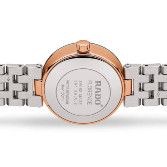 Корпус: Нержавеющая сталь с частичным PVD-покрытием розового золота. Металлик циферблат с золотистыми стрелками и часовыми индексами, декорирован 4 бриллиантами. Сапфировое стекло. Диаметр 28 мм. Водонепроницаемость 30 метров.