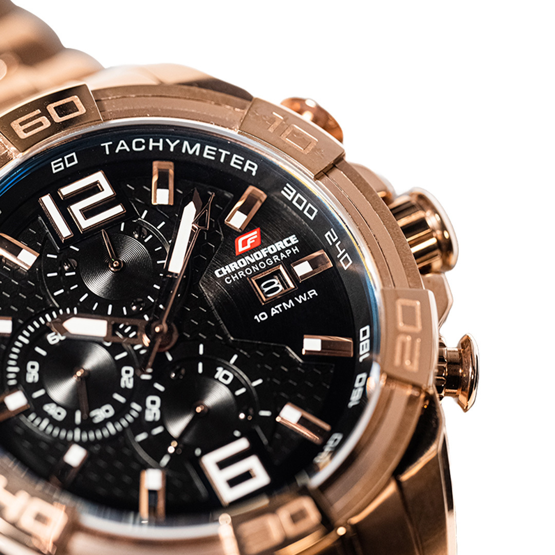 Ремешок: Браслет выполнен из нержавеющей стали с IP(ионное) покрытием. Браслетная раскладывающаяся застежка с гравировкой логотипа. Каждые часы бренда Chronoforce имеют уникальную упаковку, в виде мотоциклетного шлема.
