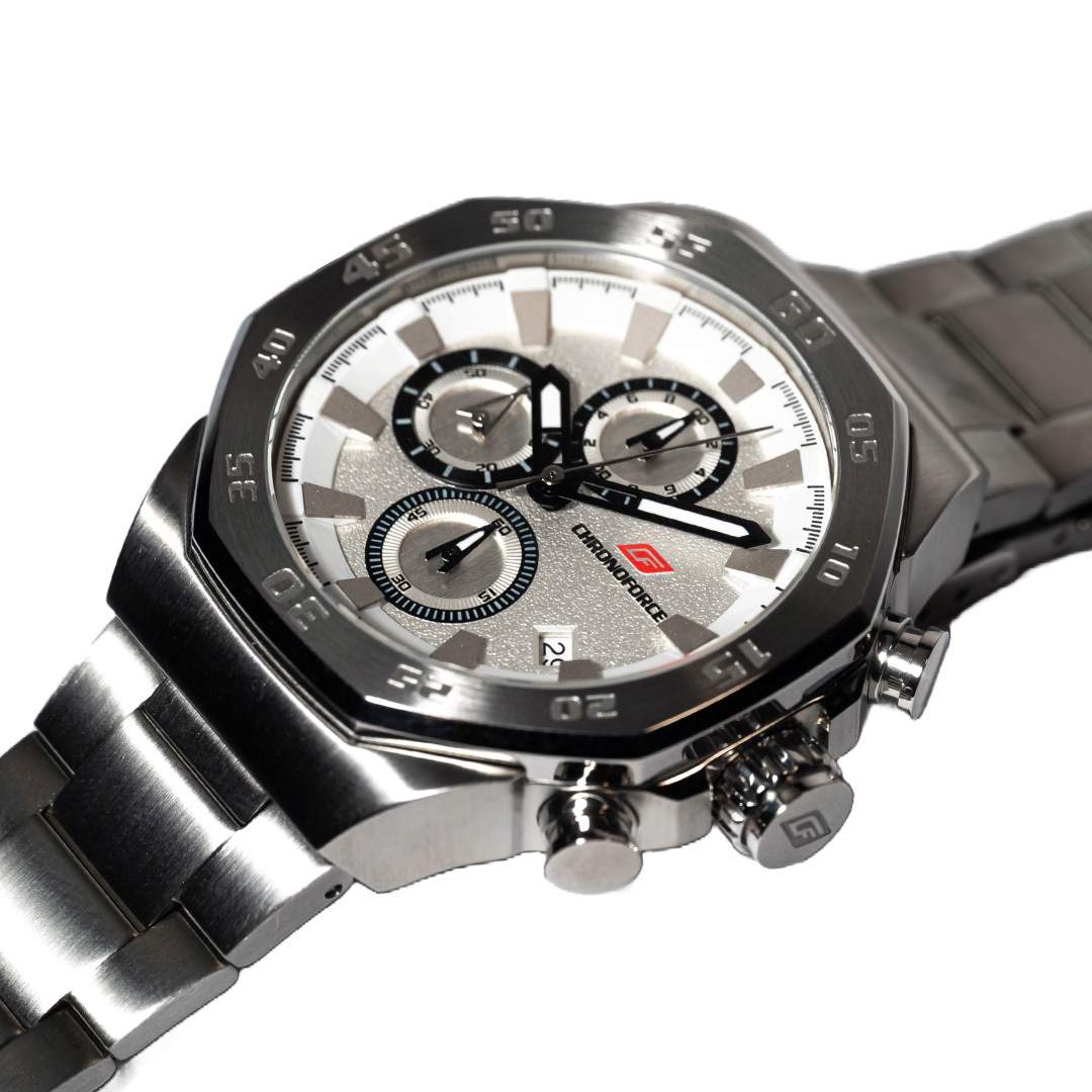 Ремешок: Контрастный браслет изготовлен из высококачественной нержавеющей стали. Каждые часы бренда Chronoforce имеют уникальную упаковку, в виде мотоциклетного шлема.