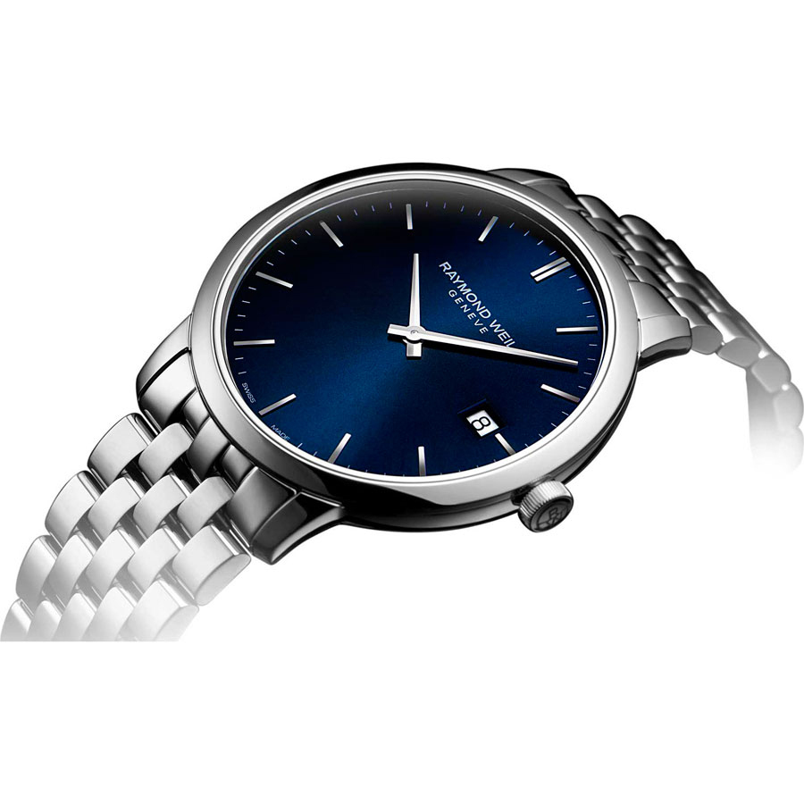 Ремешок: Модель на браслете с 5 рядами литых звеньев из высококачественной стали. Браслетная застежка, раскладывающаяся при нажатии на кнопки с двойной системой блокировки, украшена гравировкой Raymond Weil.