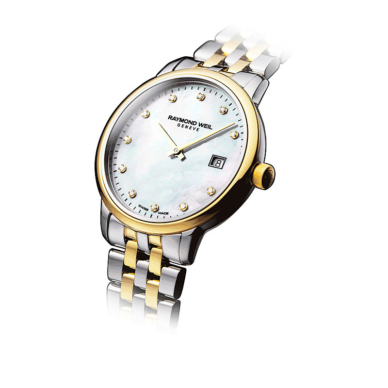 Ремешок: Модель на браслете с 5 рядами литых звеньев из высококачественной стали с частичным PVD - покрытием. Браслетная застежка, раскладывающаяся при нажатии на кнопки с двойной системой блокировки, украшена гравировкой Raymond Weil.