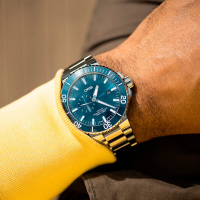 Корпус: Многокомпонентный корпус из нержавеющей стали. Вращающийся в одном направлении дайверский ободок с 60-минутной шкалой и отмеченным люминофором Super-LumiNova® нулевым маркером на чёрном керамическом кольце. Синий циферблат с накладными часовыми индексами с люминофором Super-LumiNova®. Никелевые часовая и минутная стрелки с люминофором Super-LumiNova®. Сапфировое стекло с антибликовым покрытием. Завинчивающаяся заводная головка с защитой. Диаметр: 45,50 мм. Водостойкость до 50 атм. / 500 метров.