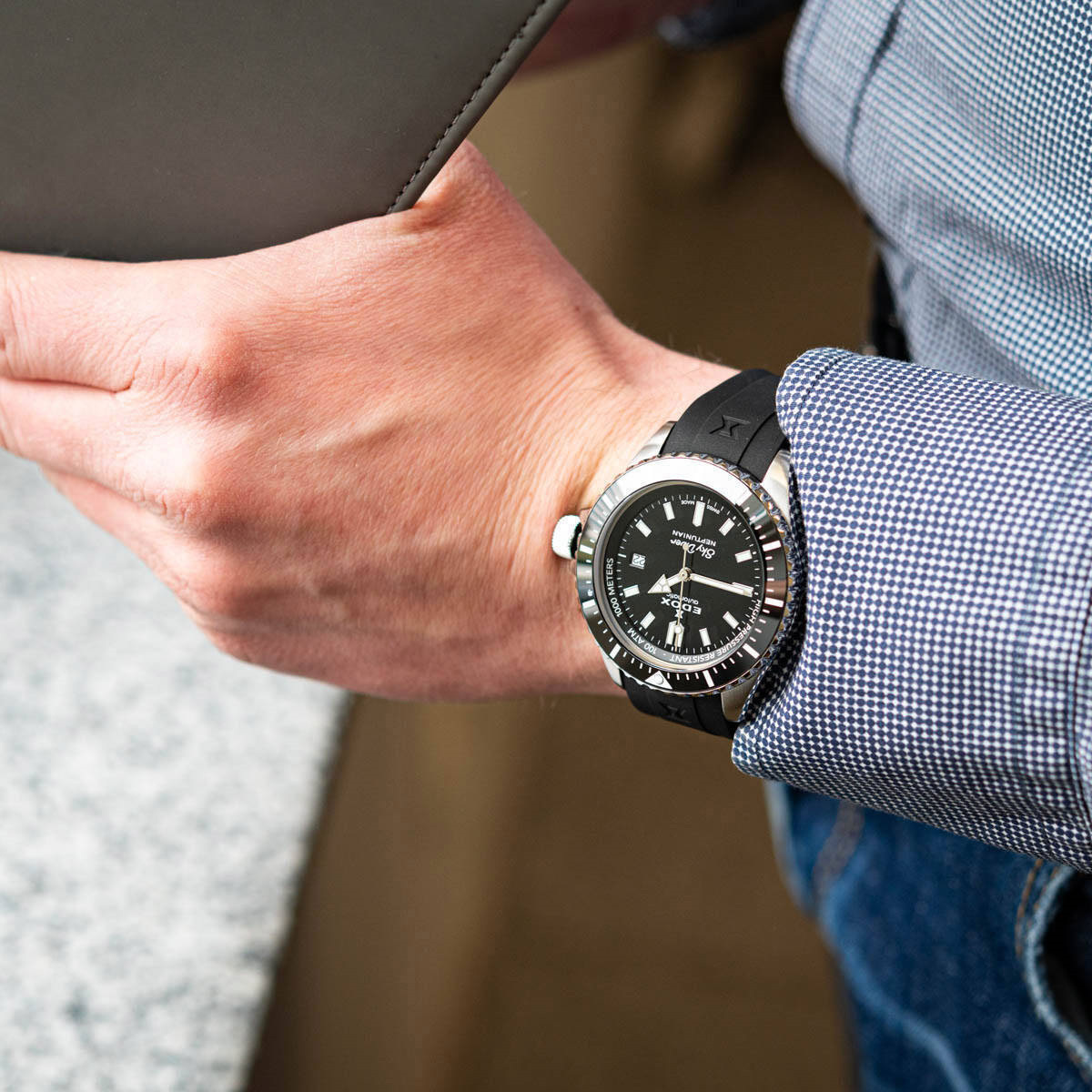 Ремешок: Чёрный каучук с классической застежкой из нержавеющей стали.