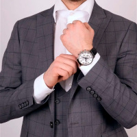 Корпус: Круглый корпус выполнен из полированной нержавеющей стали. Серебристый циферблат с узором гильоше. Накладные часовые индексы и стрелки выполнены из стали с покрытием синего цвета. Стрелки с покрытием SuperLuminova, которое обеспечивает подсветку в темное время суток. Сапфировое стекло устойчивое к возникновению царапин. Диаметр корпуса составляет 45 мм, толщина 10 мм. Водостойкость WR 50 (мытье рук, дождь).